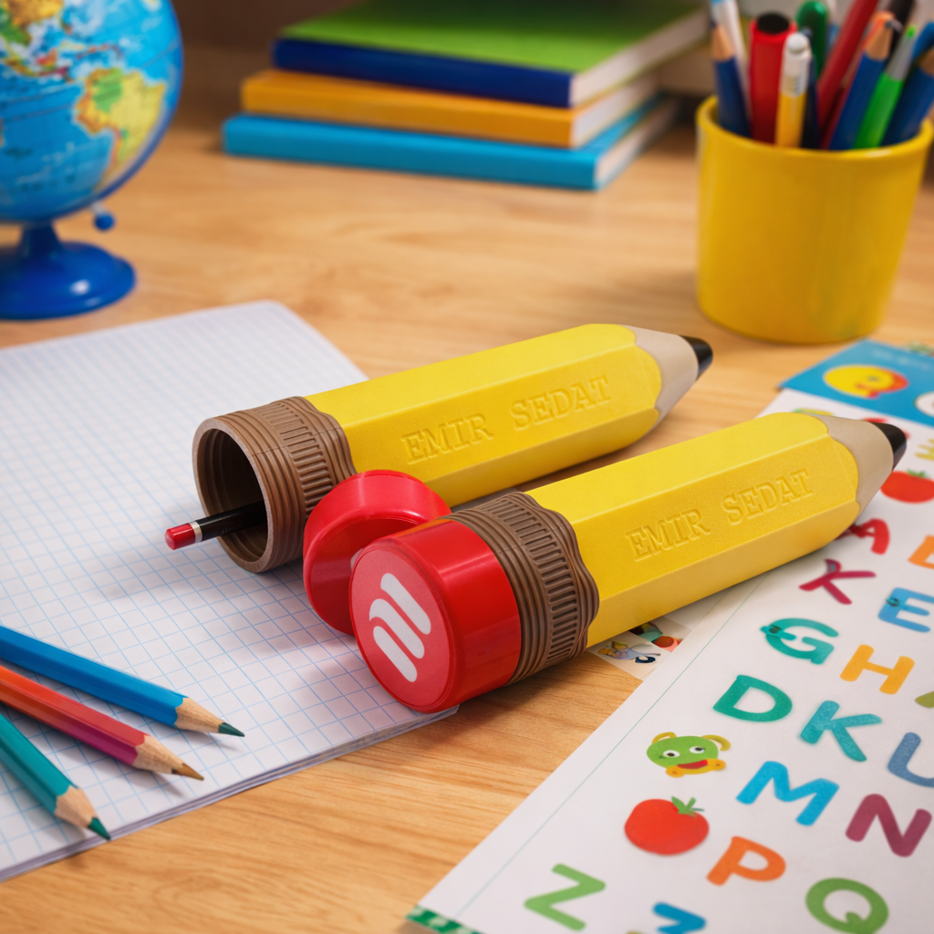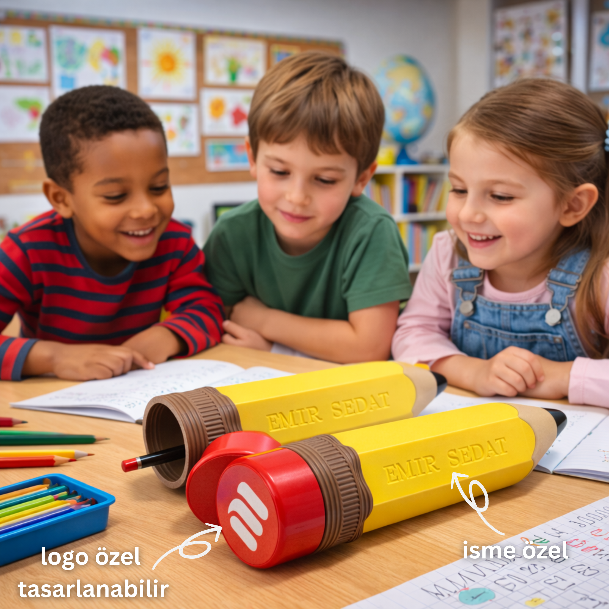 Çocukların masasında hem eğlenceli hem de düzen sağlayan kalem şeklinde kalemlik. Kalem formu sayesinde okul çantasında ve masa üzerinde dikkat çeker; kalem, uç, silgi gibi kırtasiye ürünlerini tek yerde toplar.