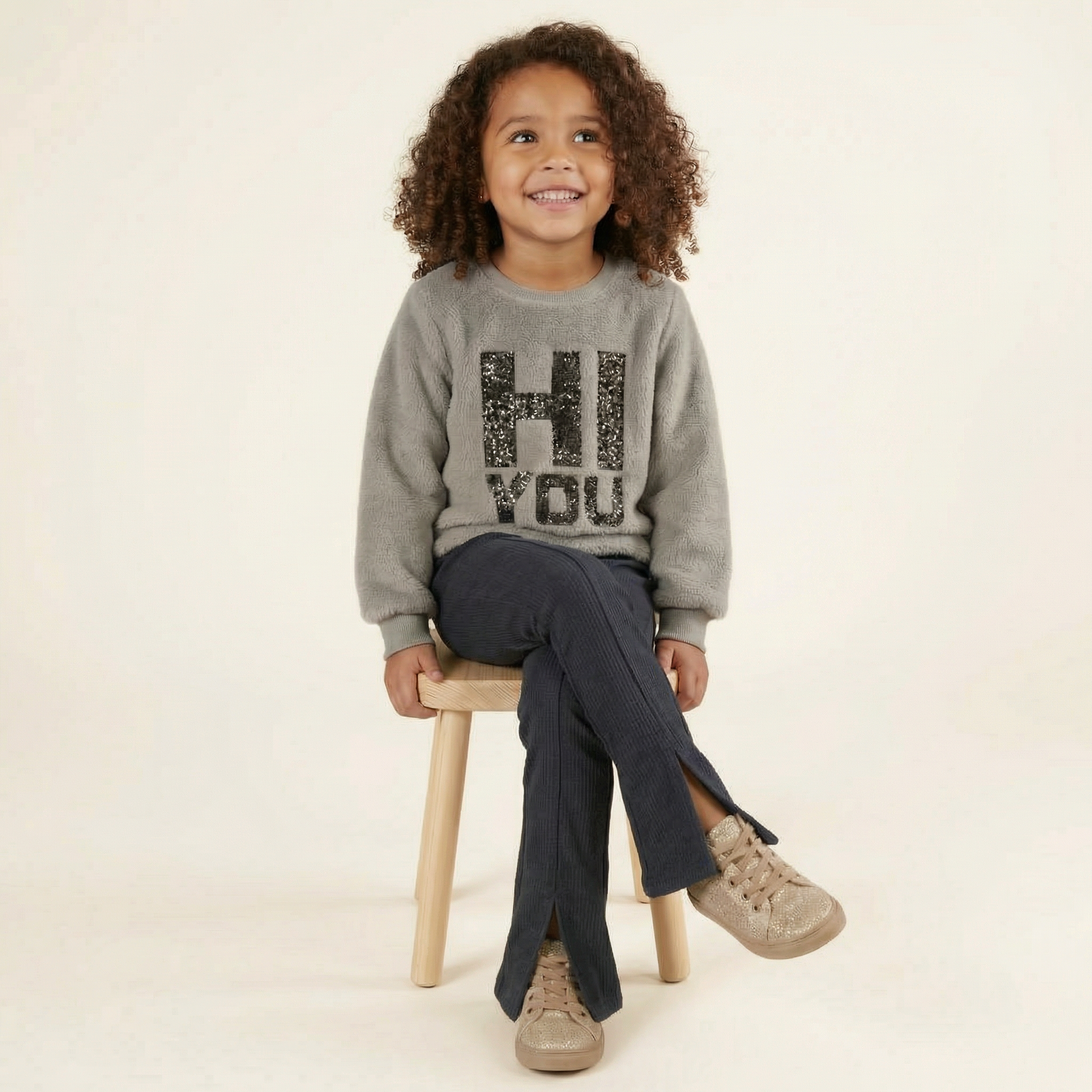 Kız çocuklar için hem rahat hem de dikkat çekici bir kombin: peluş payet detaylı yumoş kazak ve geniş paça pamuklu tayt ile gün boyu konfor ve şık görünüm bir arada. Yumuşak dokulu kazak soğuk havalarda sıcak tutarken, elastan karışımlı tayt esnek yapısıyla hareket özgürlüğü sağlar. Okul, günlük kullanım ve özel gün kombinleri için ideal bir settir.