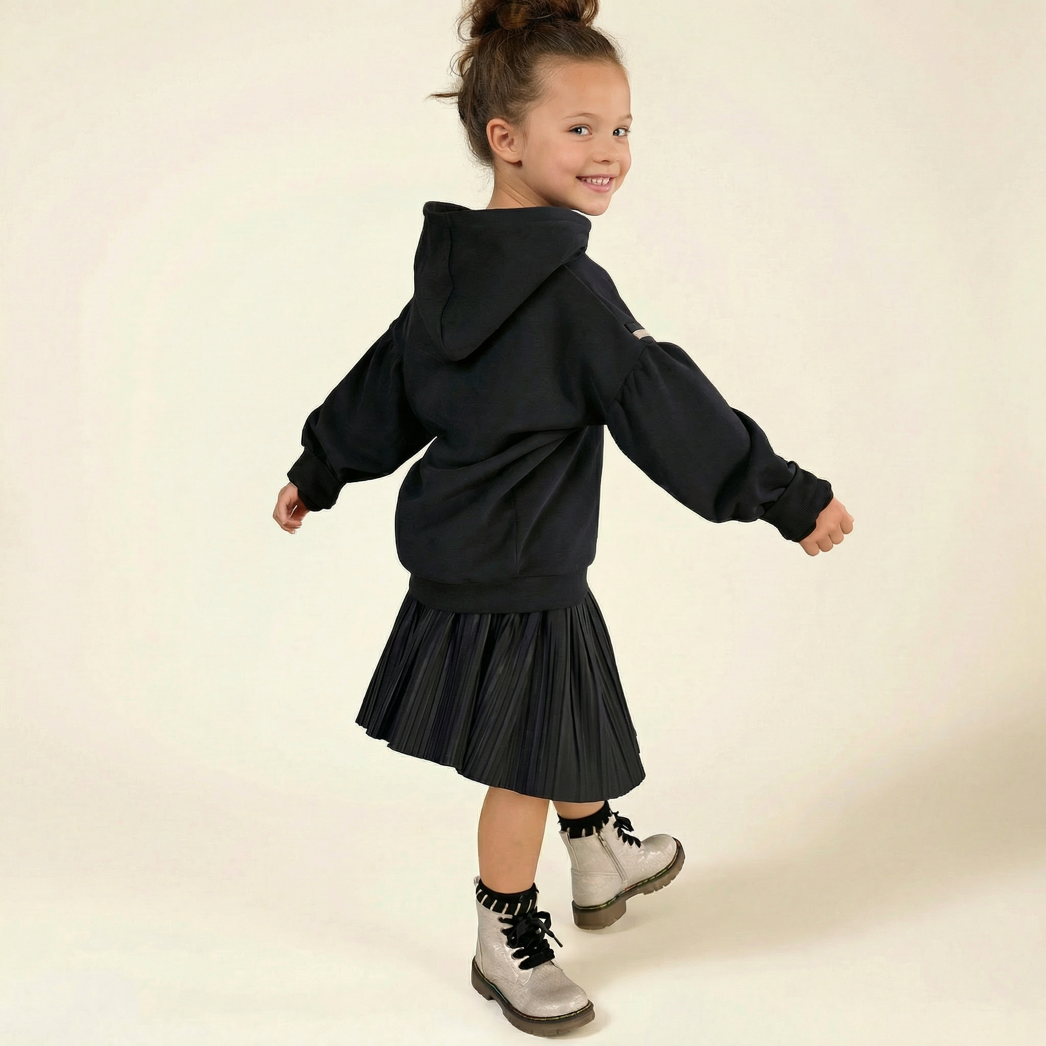 Günlük şıklığı kolaylaştıran bu kız çocuk kombini; nakış detaylı sweatshirt ve beli lastikli, astarlı pileli etek ile hem rahat hem de özenli bir görünüm sunar. Esnek bel yapısı gün boyu konfor sağlarken, astarlı pileli etek hareketli ve zarif bir duruş kazandırır. Okul günleri, doğum günü davetleri ve özel anlar için ideal bir settir.